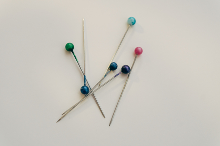 Sewing straight pins with heads of various colors on a white background