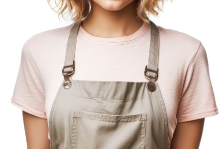 A stunning young woman wearing a white t-shirt and gray apron poses confidently against a minimalistic white background, embodying a relaxed and stylish vibe in a domestic setting.