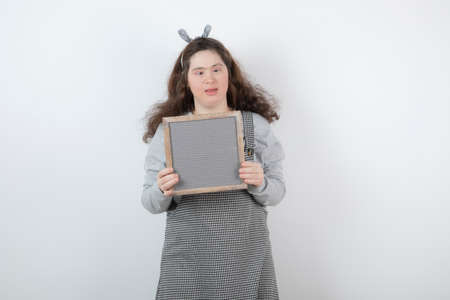 Portrait beautiful cute asian child girl on pink background with drawing board holding in hand