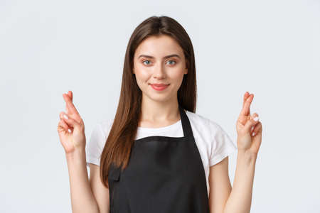Employees, job employment, small business and coffee shop concept. Confident hopeful saleswoman in black apron making wish. Barista cross fingers good luck and smiling