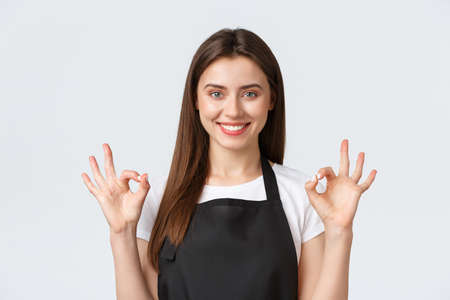Employees, job employment, small business and coffee shop concept. Friendly-looking pleasant young woman working as saleswoman or waitress in black apron guarantee quality, show okay gesture
