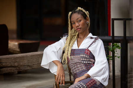 Black young woman in earrings posing and looking at camera isolated over blue background