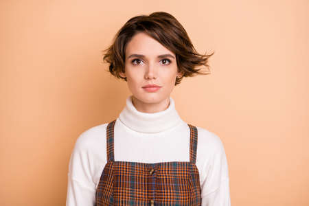 Photo portrait of serious calm girl with bob hairstyle isolated on pastel beige color background