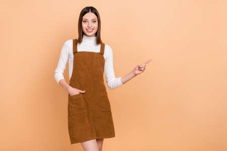 Portrait of attractive cheerful girl demonstrating copy empty space solution decision isolated over beige color background