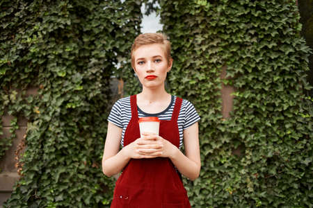 Slim sexy brunette girl wearing woman's denim overall over green tree wall texture in urban area