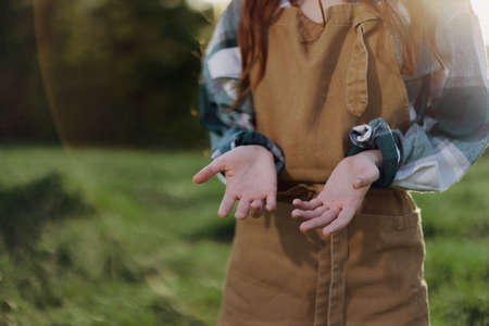 Close-up of a woman in a gardeners work apron against the green, fresh summer grass outdoors showing her hands