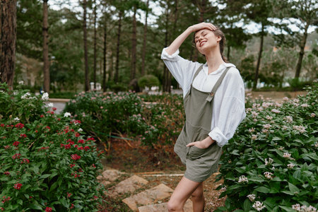 Young woman enjoying nature, wearing casual outfit with overall, smiling in a lush green garden surrounded by flowers on a sunny day, reflecting a carefree lifestyle