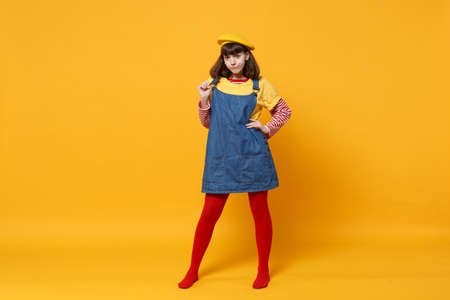Full length portrait of confused girl teenager in french beret and denim sundress standing with arm akimbo isolated on yellow wall background. People emotions, lifestyle concept. Mock up copy space