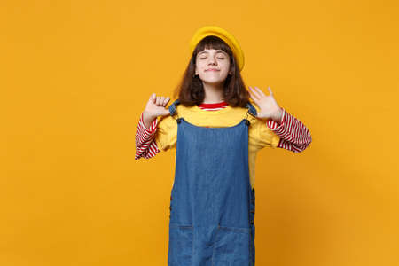 Pretty girl teenager in french beret holding hands on denim sundress, keeping eyes closed isolated on yellow wall background in studio. People sincere emotions, lifestyle concept. Mock up copy space