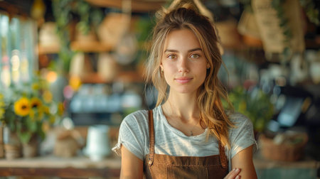 A young woman stands confidently in a sunny cafe setting, wearing a yellow polo shirt and a white apron. The bright yellow background creates a cheerful atmosphere. Green plant leaves add a touch of nature to the vibrant space.