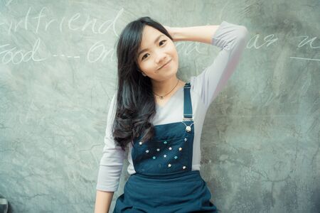 Portrait of asian student hipster woman against concrete wall Background. Smiling to camera