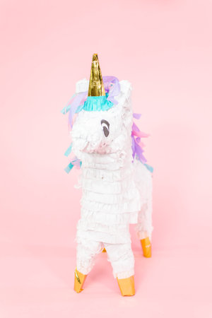Large unicorn pinata on pink background.