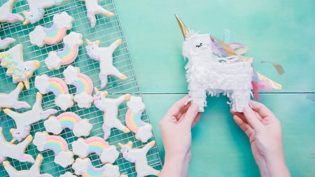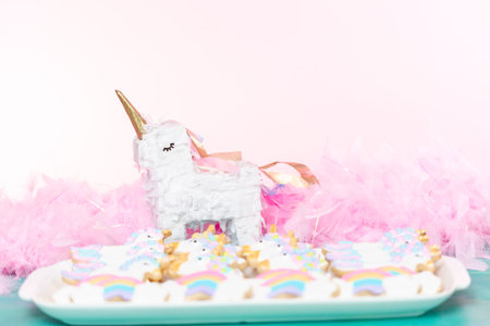 Unicorn sugar cookies decorated with royal icing at the kids birthday party.