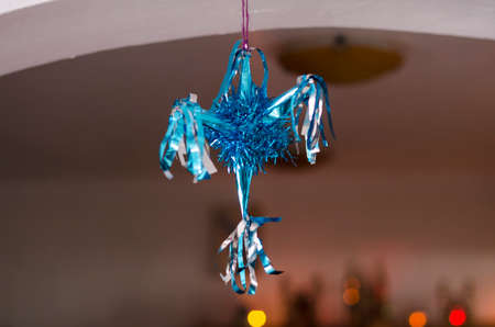 Blue pinata as decoration for Christmas and New Year on blurry background