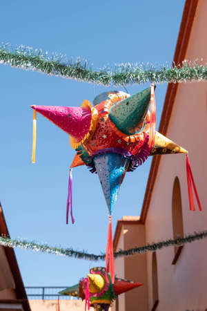 Colorful pinata and colorful flags with blue sky, hanging at the street as decoration for december