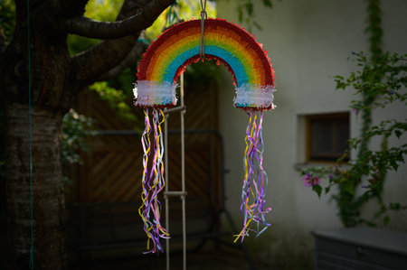 Square shaped children party mexican orange pinata hanging outdoor used for fun in posadas and birthday holiday, colourful yellow red green decoration flags. Nature palm trees garden background