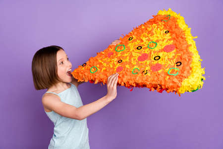 Photo of happy nice young hungry little girl hold big pizza slice eat good mood meal isolated on purple color background