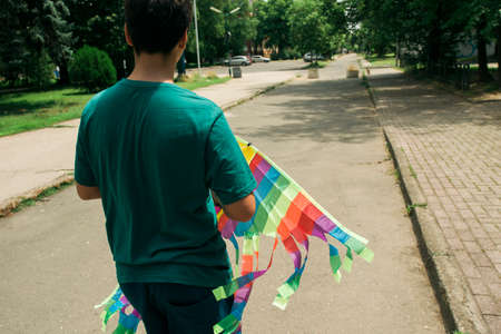 Teenager boy playing with kite in the school yard on a sunny day