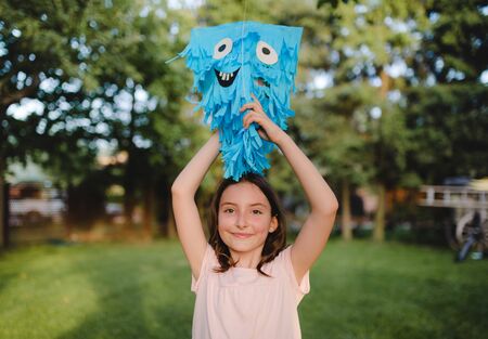 Small girl standing outdoors in garden in summer, birthday celebration concept.