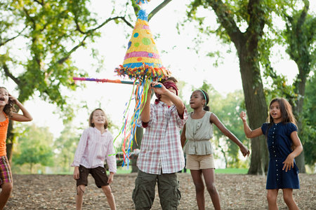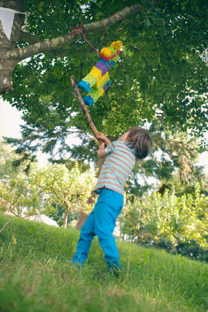 Boy at birthday party hitting pinata