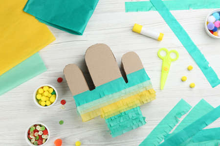 Cardboard cactus and materials on white wooden table, flat lay. Pinata DIY
