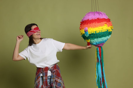 Person with bandana blindfold playing with a colorful pinata against green background