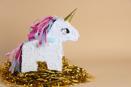 Unicorn shaped pinata and party decor on beige background, space for text
