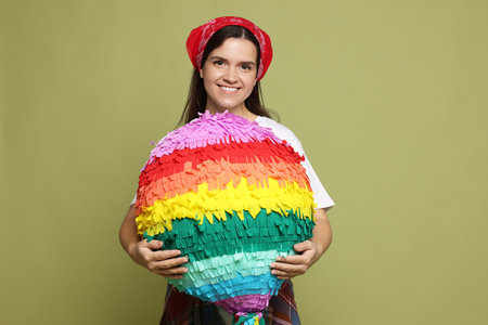 Happy woman with colorful pinata on green background