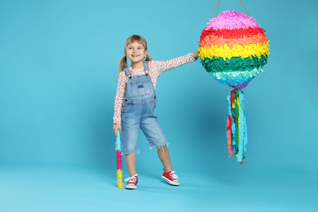 Happy girl with bright pinata and stick on light blue background