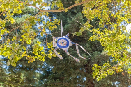 Homemade piñata filled with small toys or candy made for birthday party.