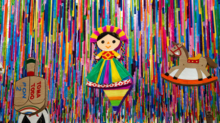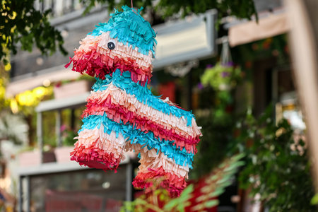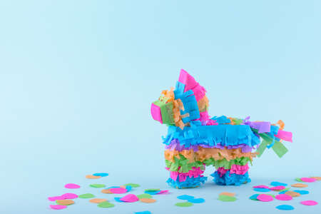 Mexican pinata party hanging background with bright multicolored celebrating birthday, Christmas, party, party songs, star and donkey figure, family fun