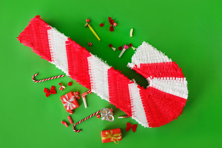 Mexican pinata in shape of cane with candies and gifts on green background