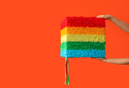 Female hands with Mexican pinata and confetti on color background