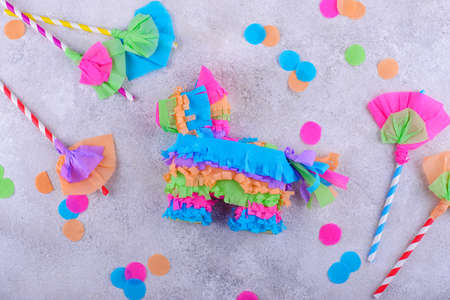 Bright donkey pinata and confetti on background, flat lay. Space for text