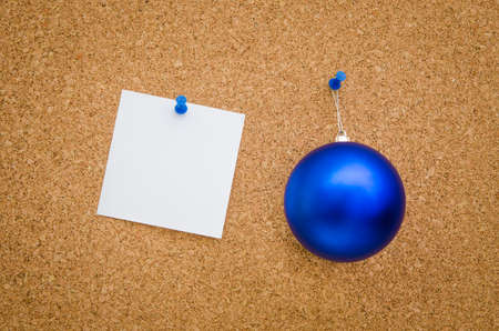 Blue christmas globe and white paper with text space pinned to a board suggesting a business office holiday christmas greeting card