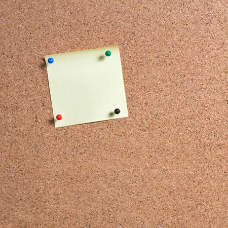 Close-up of a white paper note on a cork board, attached with a blue pushpin. Copy space.