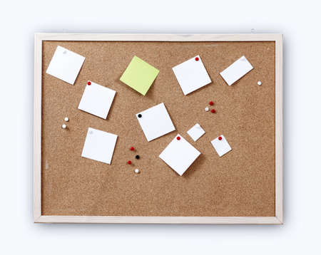 A mix of blank white and pastel notes pinned to cork board in a collage-style arrangement
