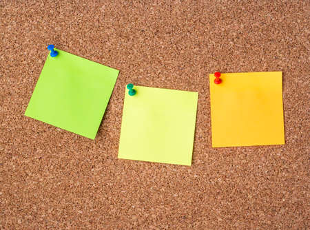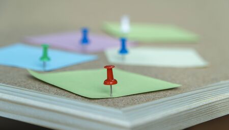 Stationary, Blank Green Blue Sticker Pined on Brown Board. Time-management, Planning.