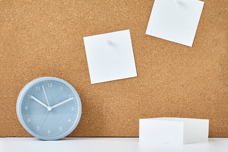 Concept of notes, goals, memo or action plan. Sticky notes on cork board and alarm clock in workplace office or home