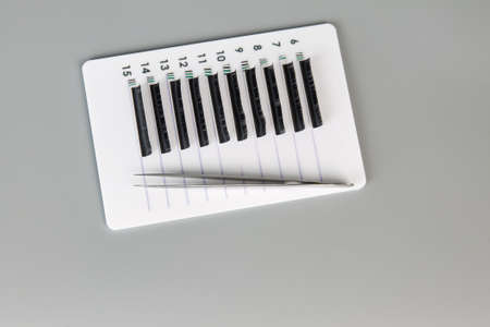 Beauty and fashion concept - tools for Eyelash Extension Procedure. Tweezers on gray background. Copyspace mockup. Top view