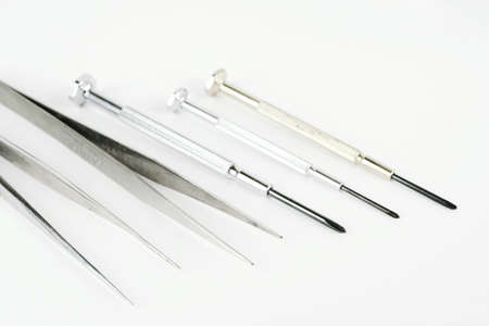 tweezers and screwdrivers on white background