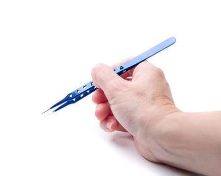 Close up picture of a person holding a tweezers in his hand in front of a white background
