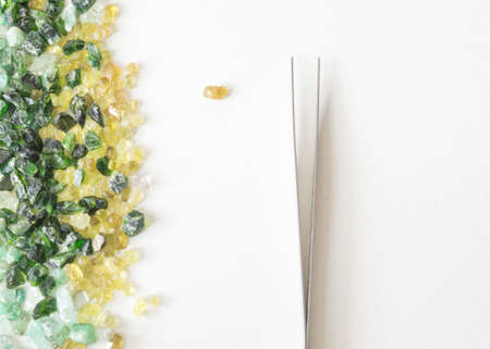 gems and tweezers on a white background. Sorting stones for jewelry.