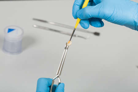 close up of hands working on artificial dentition with brush and paint in dental laboratory
