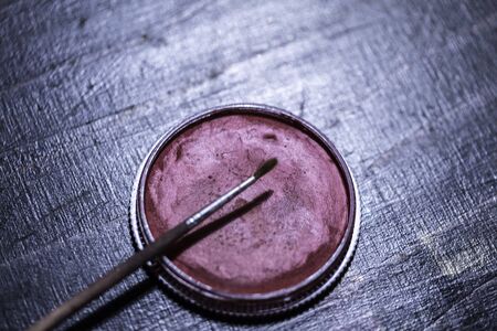 close-up of the master's hands holding a brush with which he stirs the eyebrow paint in a cup