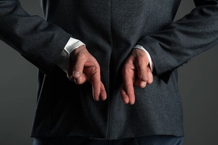The liar business man. A man with crossed finger behind his back is giving a false promises concept. Deceitful person.