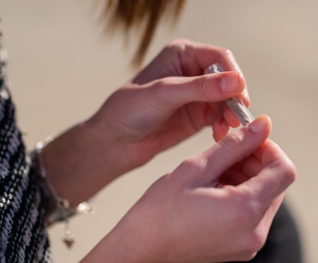 Closeup Of Woman's Hand Rolling Cigarette, Outdoors
