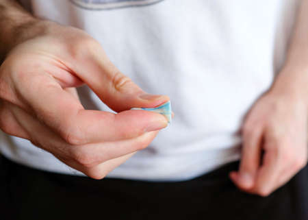 Fingers squeeze soft earplugs. preparation for use. Blurred background.