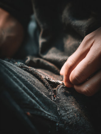 A person skillfully mends a tear in their denim fabric, focusing intently as natural light filters softly through the room.