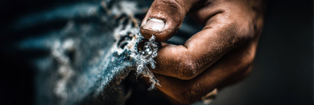 A hand grips a piece of worn denim fabric, revealing frayed edges and intricate textures in a moment that captures the essence of durability and age.